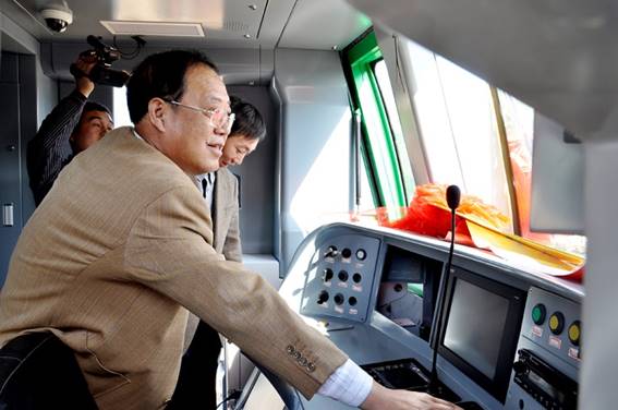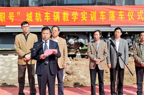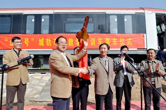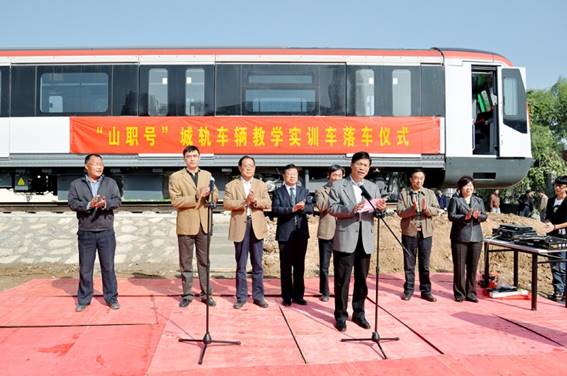 2011年10月14日上午,山東省首輛城軌車輛教學實訓車——“山職號”正式落戶山東職業學院。在落車儀式上,學院黨委書記劉邦治為“山職號”順利落車致詞,院長鄧洪基代表學院接過象征開啟列車的金鑰匙,并登車按下“山職號”啟動電源。學院領導馬文卿、徐冬、馬慶渭、祝瑞花、祝介安與南京海天軌道車輛裝備有限公司副總經理王均銀共同出席落車儀式。