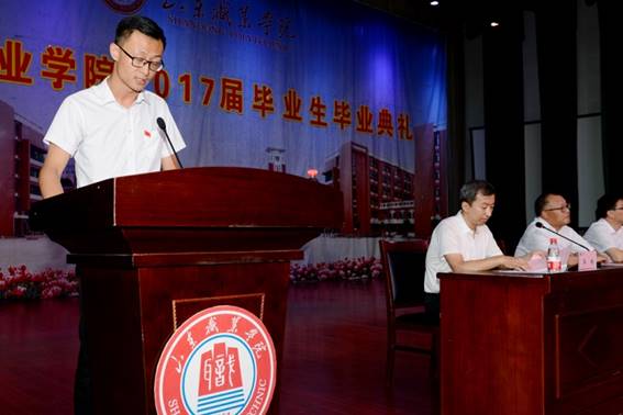 畢業典禮在莊嚴的國歌聲中拉開帷幕。學院副院長郭鵬宣讀了《關于準予2017屆畢業生畢業的決定》,黨委副書記、副院長徐冬宣讀了《關于表彰2017屆優秀畢業生的決定》。學院領導向畢業生代表頒發了畢業證書,向省級優秀畢業生代表頒發了榮譽證書。