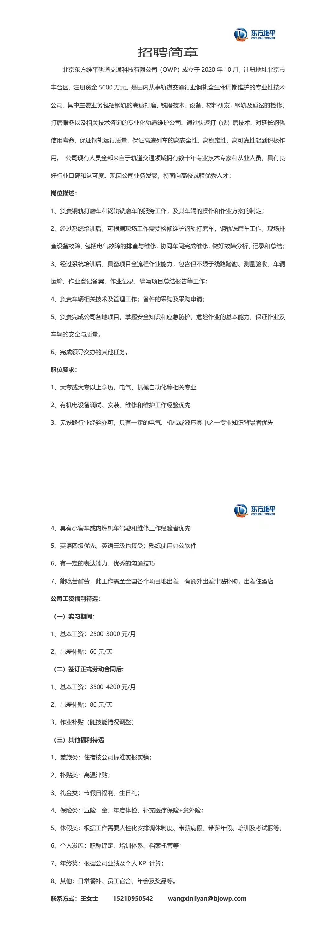 北京東方維平軌道交通科技有限公司招聘簡章