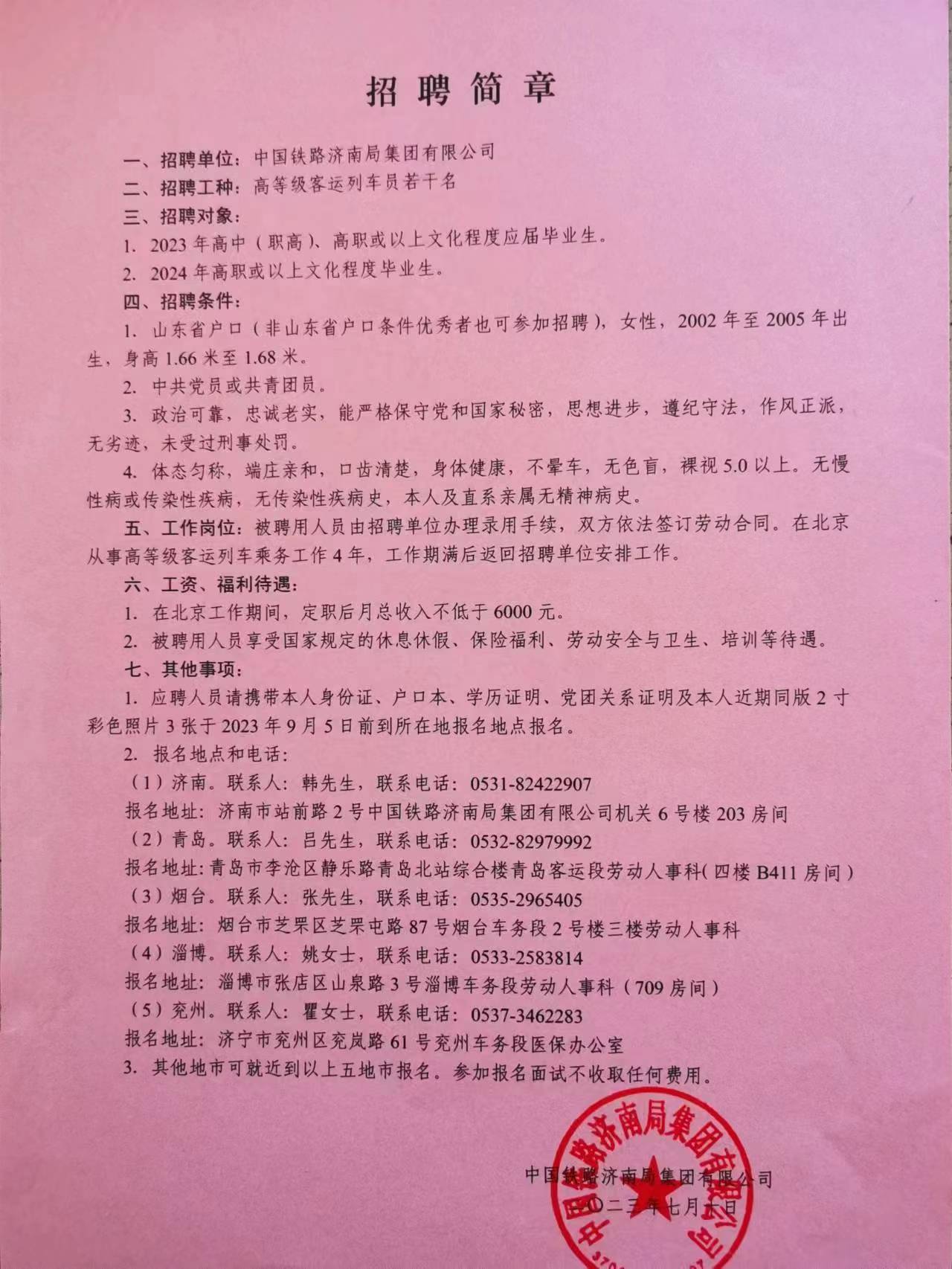 中國鐵路濟南局集團有限公司招聘高等級客運列車員