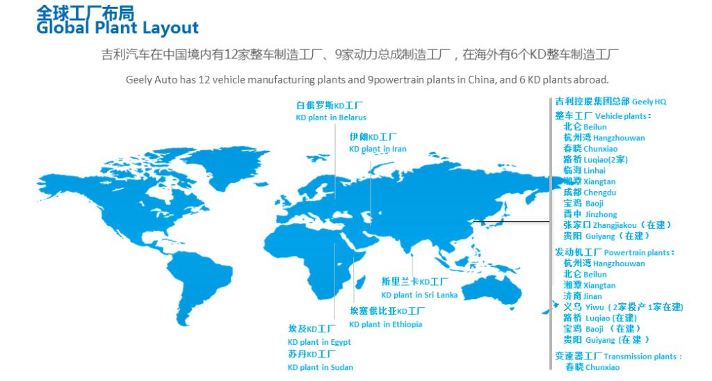 吉利控股集團在中國上海、杭州、寧波,瑞典哥德堡、英國考文垂、美國加州、德國法蘭克福等地建有造型設計和工程研發中心,研發、設計人員超過2萬人,擁有國內外有效專利超1.4萬項。在中國、美國、英國、瑞典、比利時、馬來西亞建有世界一流的現代化整車和動力總成制造工廠,擁有各類銷售網點超過4000家,產品銷售及服務網絡遍布世界各地。