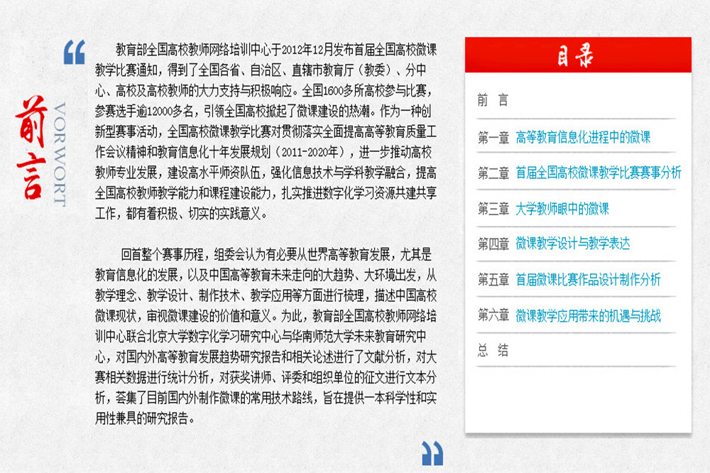 《中國高校微課研究報告》作為“首屆全國高校微課教學比賽”的延伸活動,是教育部全國高校教師網絡培訓中心聯合北京大學數字化學習研究中心、華南師范大學未來教育研究中心進行的“微課教學在中國高校的發展與實踐”專項研究課題成果,其對高等教育信息化進程中的中國高校微課進行了系統化、全方位的研究與分析,是兼具科學性與實用性的教育教學研究報告。 |