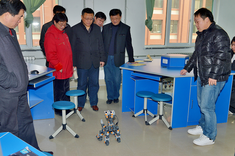 液壓氣動實訓中心、數控機床裝調維實訓室、FANUC數控系統實訓室是機電裝備系的“高精尖武器庫”。在這里,考察團向系主任王秋敏詳細了解了該系“項目導師制”的特色教學。期間,學生還向考察團展示了由他們親自動手安裝調試的六足機器人和機器狗。