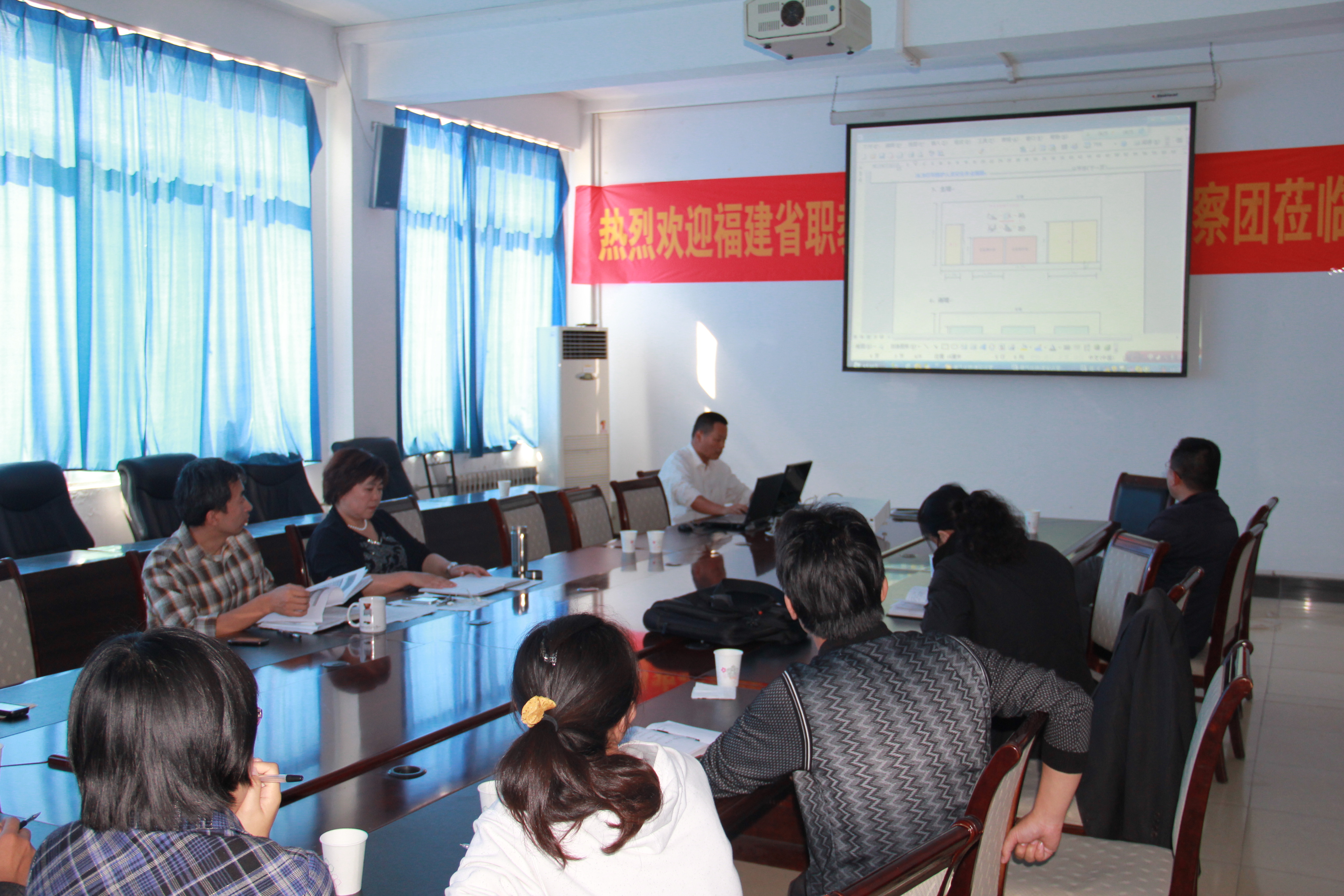 會上項目組負責人林毓梁匯報了實驗實訓室內涵建設方案改進情況,逐一介紹、展示了11個實驗實訓室的內涵建設規劃圖。各位領導肯定了建設方案,同時給出了內涵建設應更多的體現行業特色、避免重復懸掛標語等改進建議。