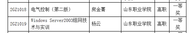 20111031,山東省教育廳網站“第二屆山東省高等學校優秀教材評審結果公示”中顯示,在山東省教育廳組織的“2010年第二屆山東省高等學校優秀教材評選活動中,由山東職業學院電氣工程系房金菁教授主編的《電氣控制》(第二版)教材獲評選活動高職組一等獎。