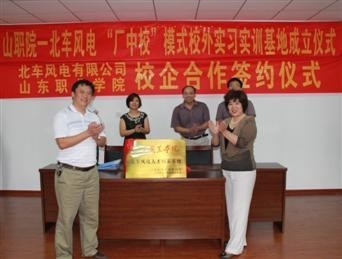 2012年8月20日,山東職業學院機電裝備系與北車風電有限公司簽訂校企合作協議及“廠中校”模式校外頂崗實習基地協議。學院副院長祝瑞花及機電裝備系主任王秋敏、副主任王培林、就業辦主任唐勇參加了簽約儀式。協議就雙方合作內容、雙方職責、頂崗實習期間學生的勞動保護及學生待遇等方面進行了協商確定。此次簽約為后續的學生頂崗鍛煉、老師的掛職鍛煉、校內外實訓場地建設及課程建設都提供了很好的合作契機。