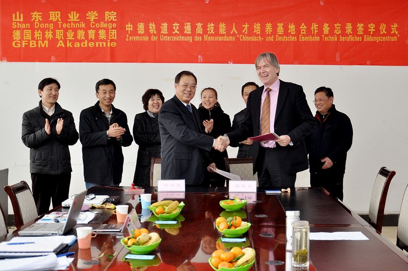 3月19日,中德軌道交通高技能人才培養基地合作備忘錄簽字儀式在山東職業學院舉行,學院院長鄧洪基與德國柏林職業教育集團董事會主席Vogelsang(福格臧)先生代表校企雙方攜手簽署合作備忘錄。柏林職業教育集團執行董事、柏林州政府_北京柏林友好城市框架下職業教育領域合作官方負責人、同濟大學中德職業技能認證研究中心項目研發負責人、柏林州教育資源有限公司董事長閆俊女士,國家科學技術部、中國駐奧地利/駐德國大使館原科技參贊陳文休先生,學院副院長祝瑞花,教務與科研處處長郭鵬,國際交流中心主任王輝,軌道交通系主任吳書鋒、副主任王紹軍出席簽字儀式。