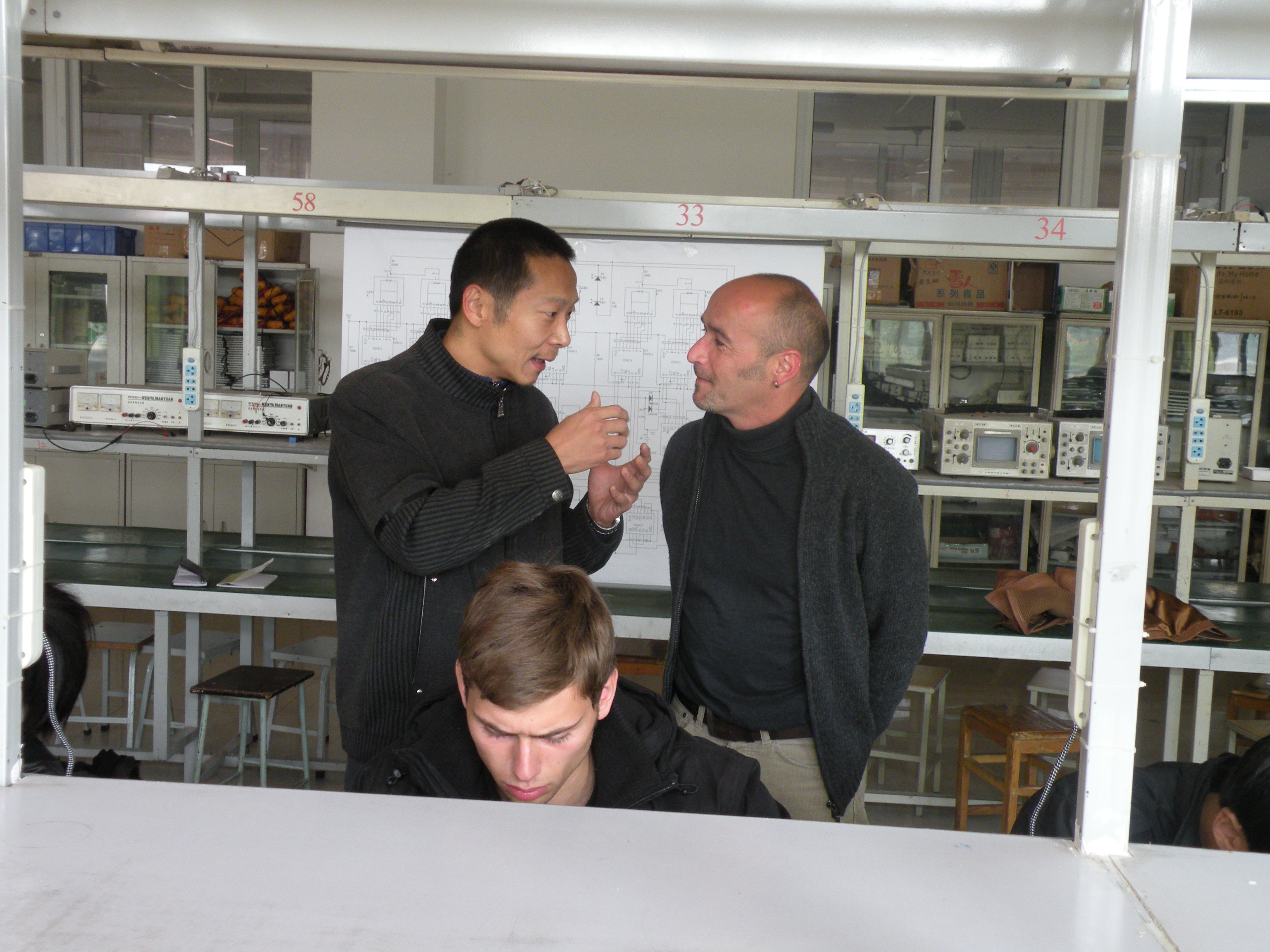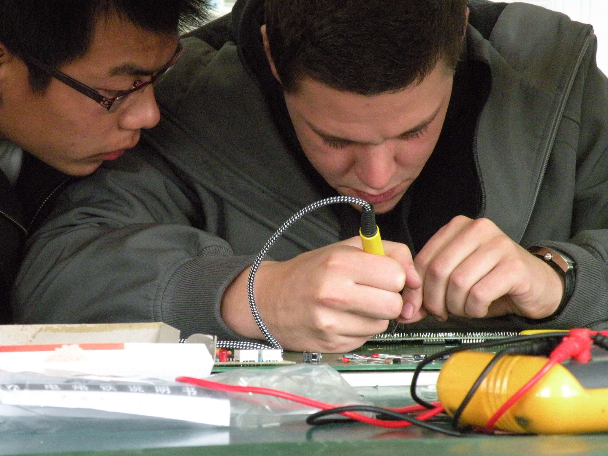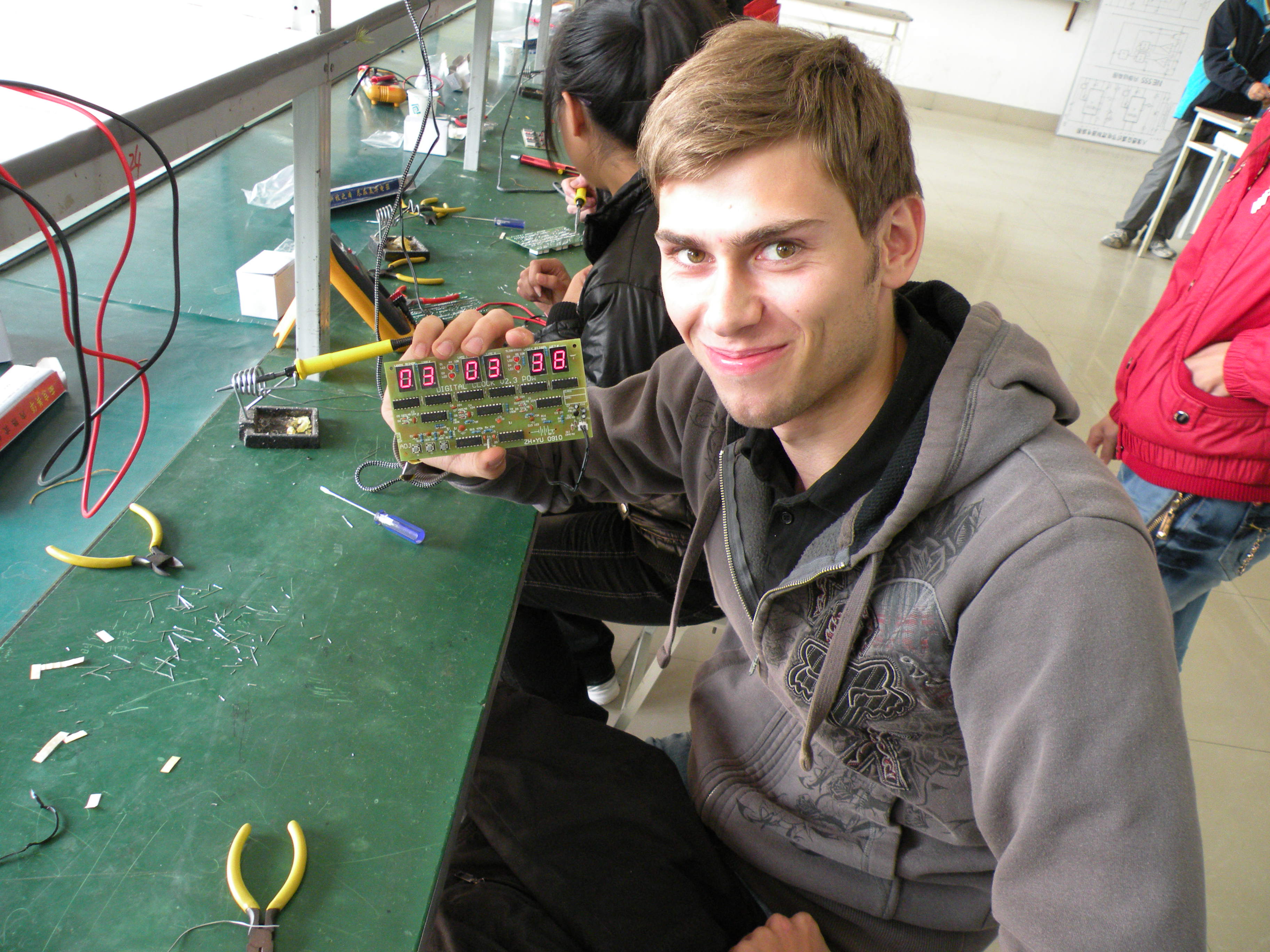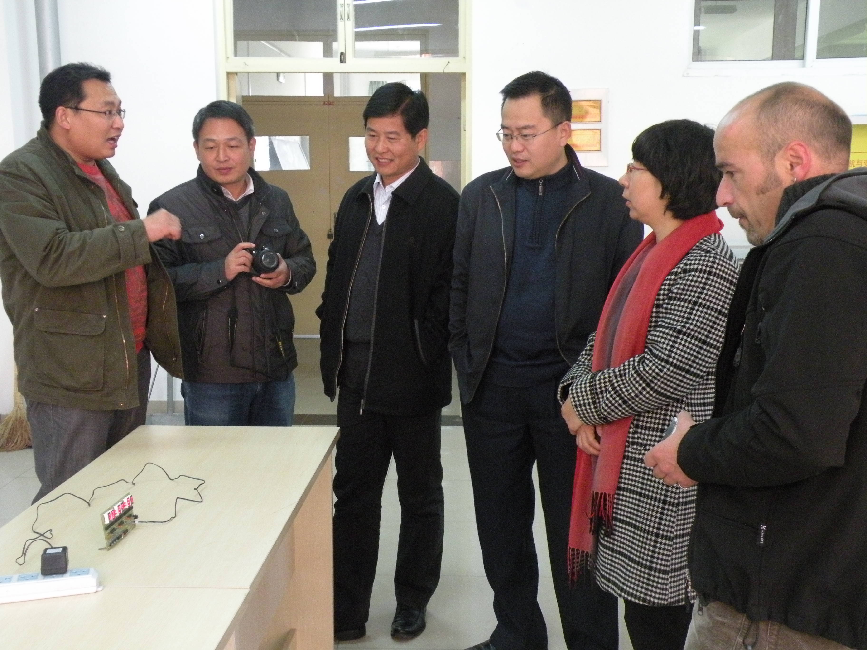 10月28日上午,德國師生到我系電工電子項目教學教室參加學習交流。在電工電子項目教學負責人劉剛老師的指導下,雙方師生一起開展了《精密數鐘的設計與制作》項目的教學活動。在劉剛老師與德國教師的指導下,雙方同學經共同努力,成功完成了該項目的設計與制作。德國學生拿著自己的作品和我系學生一起拍照留念,幸福的笑容詮釋著自己內心的喜悅。