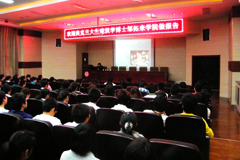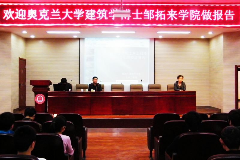 鄒拓博士就讀于新西蘭奧克蘭大學土木工程系建筑專業(該大學是新西蘭規模最大、科系最多的高等教育機構,世界排名第60位),長期從事建筑抗震方面的研究。報告會上鄒拓博士介紹了他在奧克蘭大學的生活和學習情況,新西蘭建筑方面的特點及抗震措施以及他在臺灣參加地震工程模型設計挑戰賽的過程和感想,并對其近期關于“長期監測新西蘭主要橋梁的健康度”研究方面的博士論文做了闡述。鄒拓博士用風趣的語言、精彩的圖片和錄像深入淺出地講述了建筑物抗震方面的研究。最后,土木工程系副主任李曉良做了總結性發言。