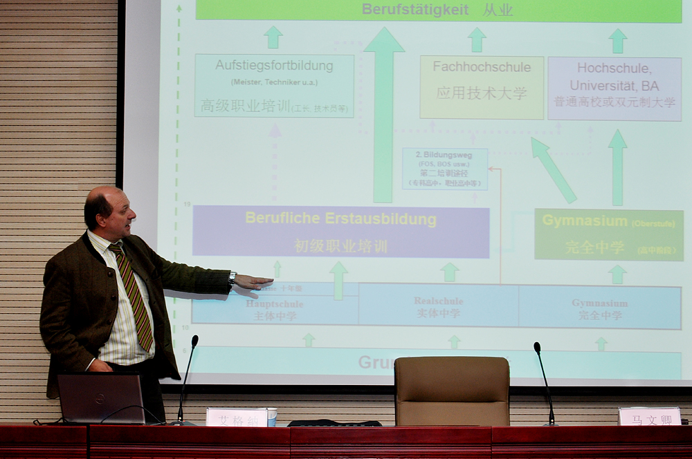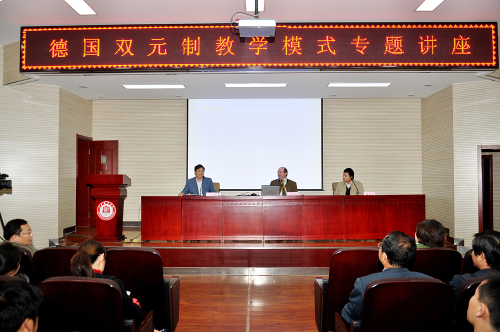艾格納博士在講座中談到,“雙元制”職業教育的突出特點主要表現在:一、同生產緊密結合;二、企業的廣泛參與;三、互通式的各類教育形式;四、培訓與考核相分離的考核辦法。區別于其它職業教育模式,德國“雙元制”職業教育的特性主要表現在:一、兩個學習地點——企業與職業學校;二、受訓者的雙重身份——學生與學徒;三、兩類教師——實訓教師與理論教師;四、兩種指導文件——《職業培訓條例》與《理論教學大綱》;五、兩種教材——實訓教材與理論教材;六、兩種考試——實訓技能考試與專業知識考試;七、經費的兩條渠道——企業與國家。