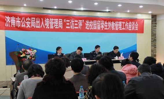 2月29日,濟南市公安局出入境管理局“三訪三評”進校園?留學生、外教管理工作座談會在山東大學舉行。濟南市公安局出入境管理局局長李軍、副局長王薇,山東省教育廳國際交流與合作處副處長孫祖興,濟南市外國專家局局長張賓等出席座談會。我院受邀參加了本次座談會。濟南市42家具有接收留學生、聘請外教資質的大專院校和教育機構外事工作負責人70余人參加了座談會。