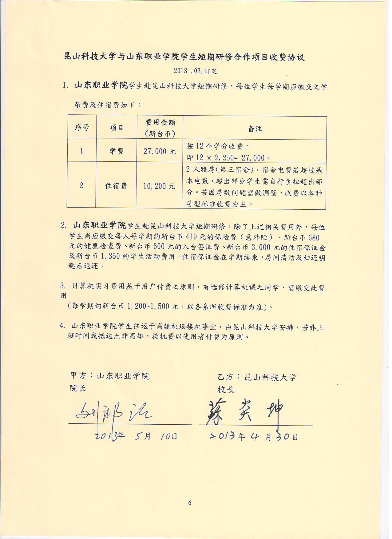 昆山科技大學與山東職業學院學生短期研修合作項目收費協議