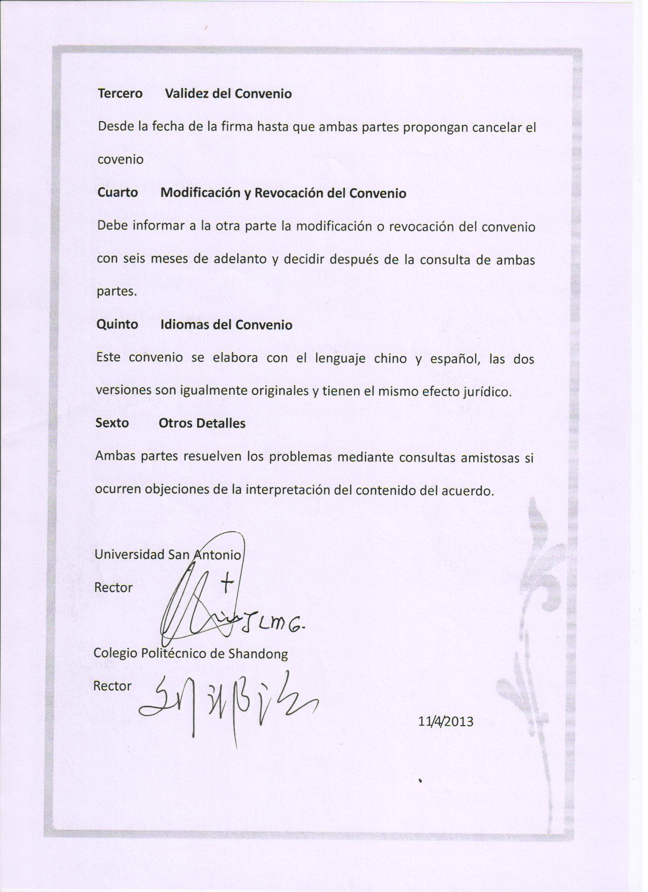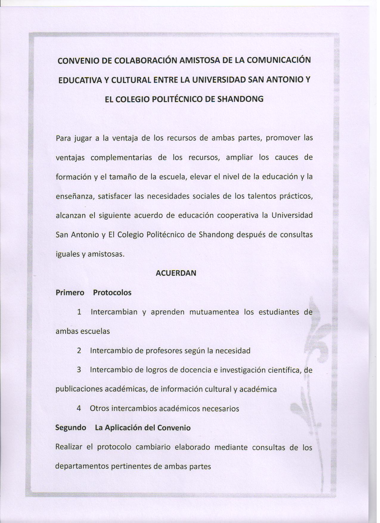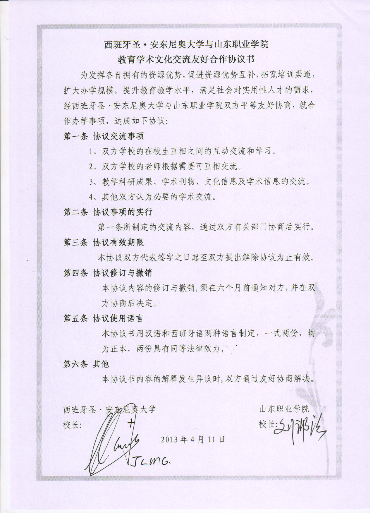 山東職業學院與西班牙圣?安東尼奧大學教育學術文化交流友好合作協議書