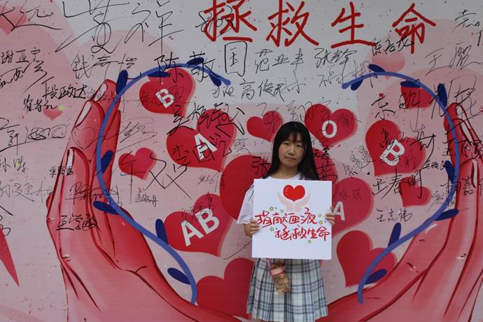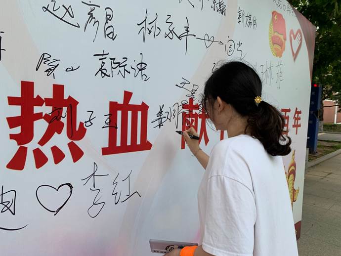 獻血結束后,同學們紛紛在簽名墻上簽名留言。