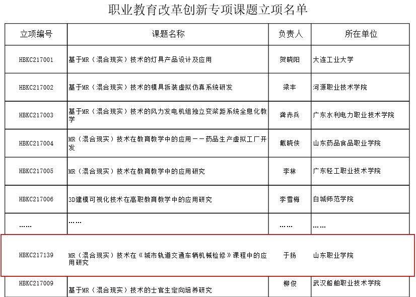 7月26日,教育部公布了“第二批國家級職業教育教師教學創新團隊立項建設單位”遴選結果,我校城市軌道車輛應用技術專業教學團隊成功入選。同時,教育部行指委公布職業教育改革創新課題立項名單,我校于揚老師負責的《MR(混合現實)技術在<城市軌道交通車輛機械檢修>課程中的應用研究》名列其中。