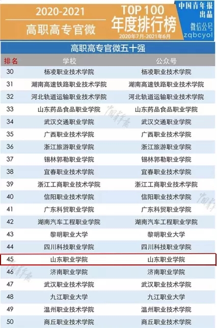 近日,在《中國青年報》發布的《2020-2021高職高專官微年度排行榜》中,我校官方微信公眾號榮獲2020-2021年度全國高職高專官微五十強。