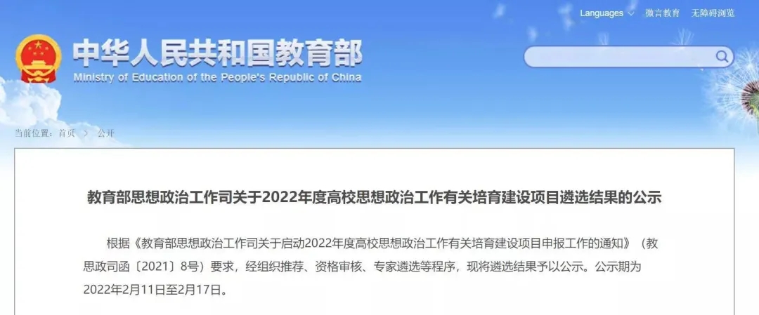2月11日,教育部官網發布了《教育部思想政治工作司關于2022年度高校思想政治工作有關培育建設項目遴選結果的公示》,我校申報的《“勇往直前,敢為人先”——“鐵?道”文化育人體系的構建與實施》項目入選“高校思想政治工作精品項目”。