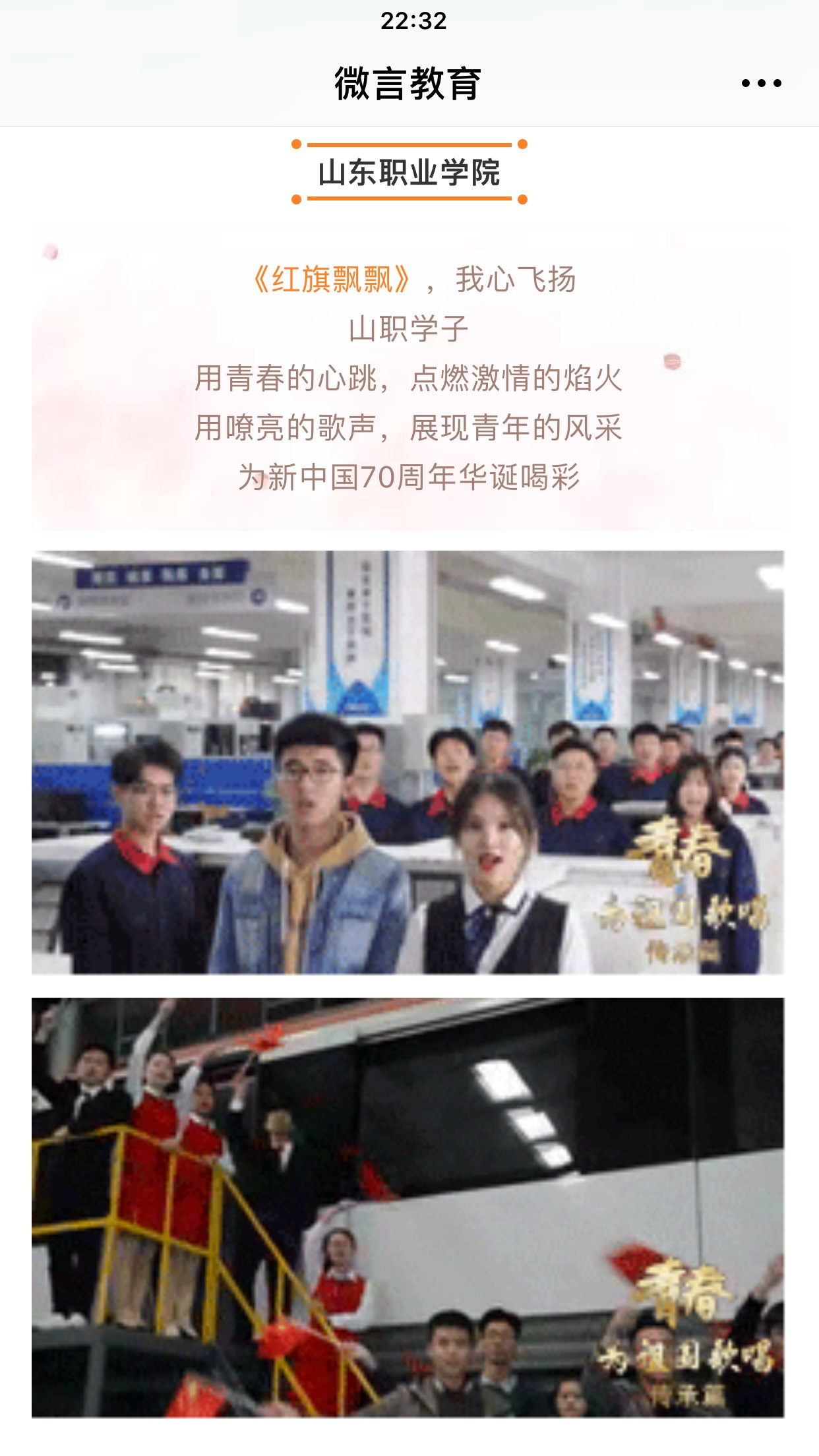 5月15日晚,教育部官微“微言教育”刊播了“青春,為祖國歌唱”我院拍攝的作品《開著火車唱著歌》。