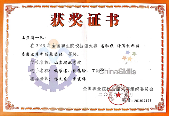 6月14日至16日,2019年全國職業院校技能大賽(高職組)“計算機網絡應用”賽項舉行。此次比賽共有來自全國31個省、市、自治區的111所職業院校代表隊參加。我院學生候學寶、張嵩晗、丁兆坤同學在楊文虎、李憲偉老師的指導下,與全國職業院校技能高手同臺競技,發揮出色,最終以扎實的專業知識和精湛的專業能力獲得大賽一等獎。