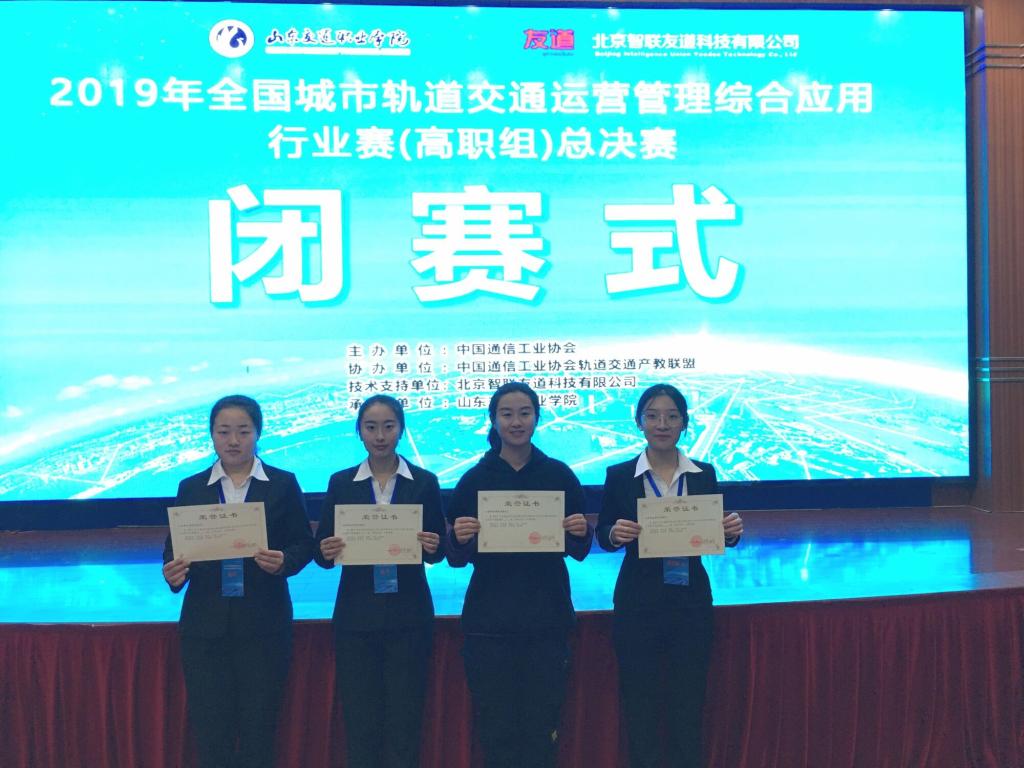 本次大賽由中國通信工業協會軌道交通產教聯盟主辦,北京智聯友道科技有限公司提供技術支持。賽事旨在引導軌道交通類專業的課程設置和教學改革,提高運營管理相關專業的人才培養質量,提升學生的專業技能和職業素養。比賽項目包括行車組織任務及應急處置任務,我院城市軌道交通系參賽選手王忱、孫歡歡、李尚尚、周濤配合默契,憑借扎實的專業知識、良好的職業素養和過硬的心理素質取得優異成績,團隊指導老師管莉軍、李凌燕、張風琴獲“優秀指導教師獎”。