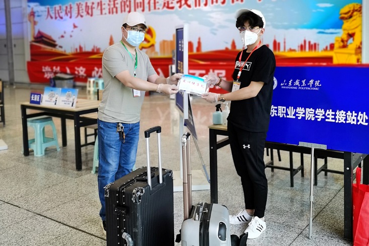 學院在濟南火車站等設置了接站點,實行專人包干接站。經過信息核對、健康掃碼、消毒殺菌、體溫檢測后,接站的老師為每一名學生送上愛心健康包,其中包括一次性醫用口罩、消毒濕巾、消毒手套以及《新型冠狀病毒肺炎防控指南》《疫情防控學習生活指南》《疫情防控心理健康指南》等,并幫助他們搬運行李,安排專車送至學校。