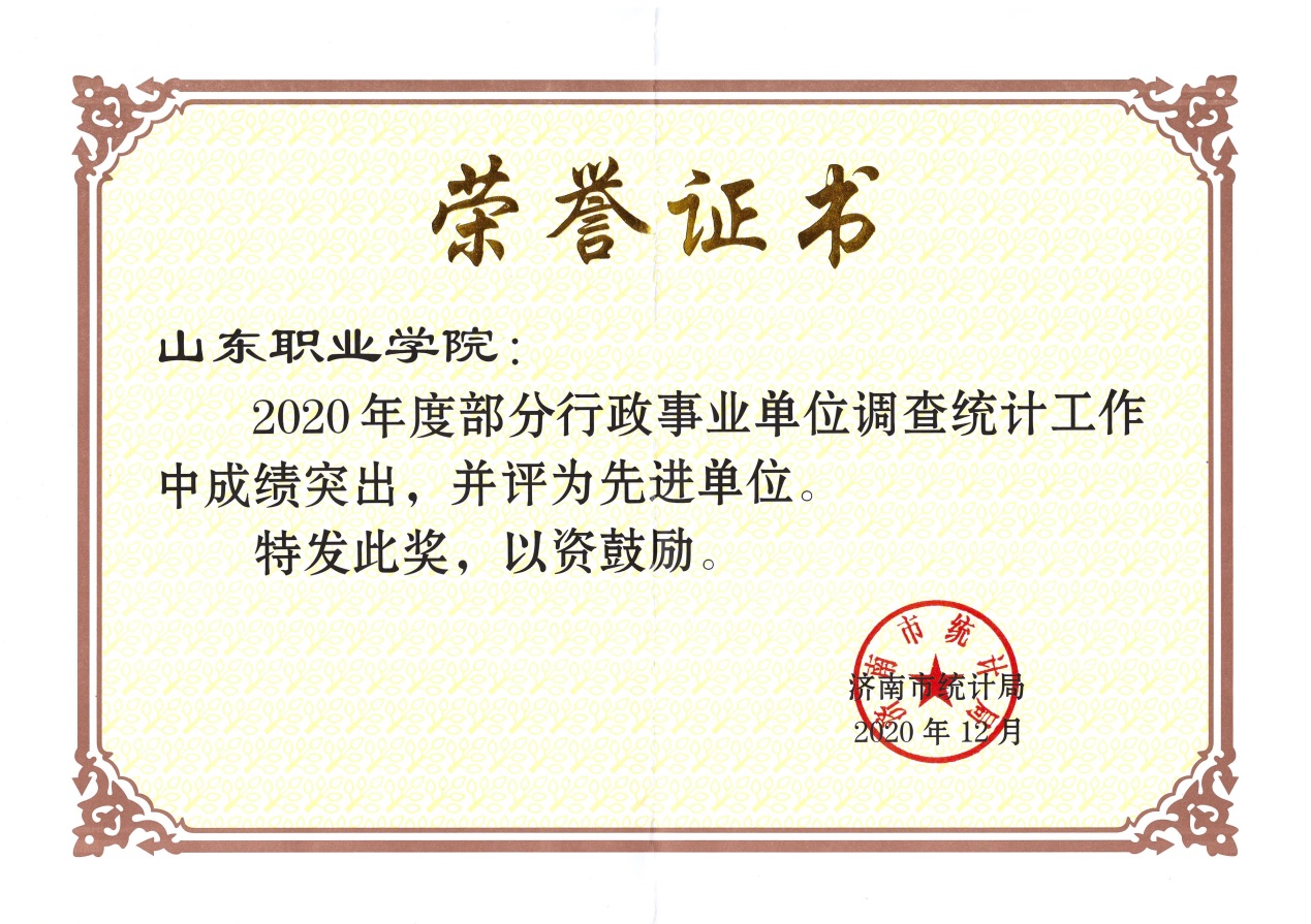 2020年12月,濟南市統計局在對全市各報表單位2020年度統計工作全面考核的基礎上,評選出一批統計工作先進單位,并予以通報表揚。我校在2020年度行政事業單位調查統計工作中成績突出,被評為統計工作先進單位。