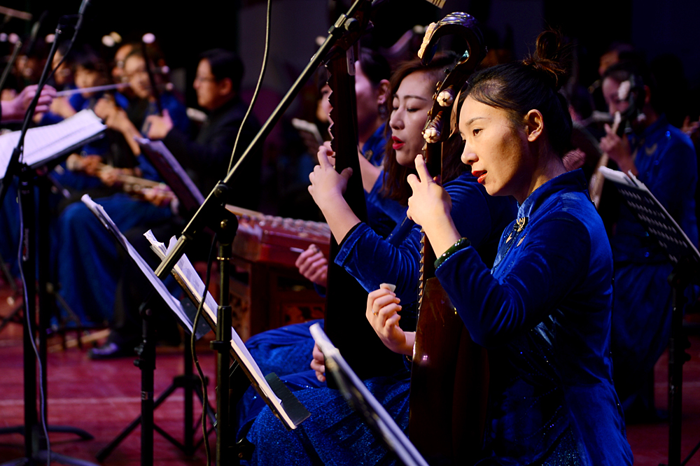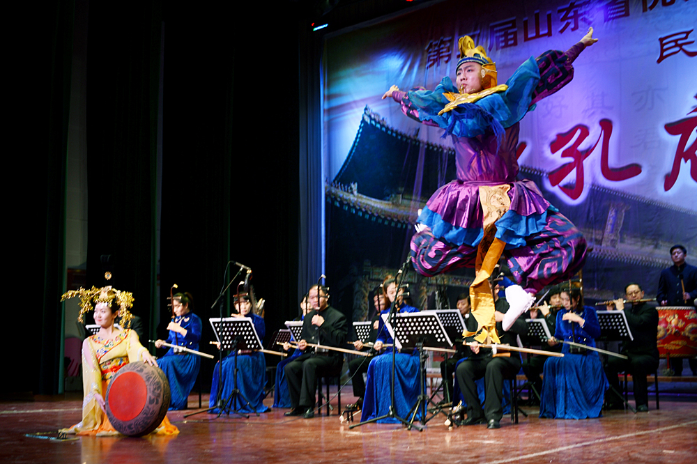 這是一場匯聚山東民族音樂元素的宏大表演,更是一場試圖跨越幾千年的音樂靈魂的交流和碰撞。古琴、琵琶、揚琴、古箏、二胡、嗩吶、笛子、笙、編鐘、大鼓等30多種樂器有序交織在一起,鼓號齊鳴,引弦放歌,金鐘金聲,玉罄玉震,用高雅藝術訴說孔子和儒家文化的傳統之旅。