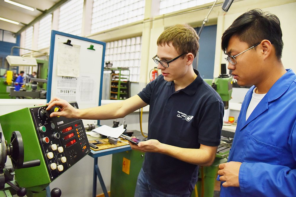 項目開始的第一周為適應性學習和操作。學院2位教師和6名學生在德方師生的幫助下,熟悉掌握德方機器設備的性能和使用方法,同時中德雙方學生一對一組成小組,加強交流磨合。經過一周的訓練提升,雙方學生越來越熟悉,默契度逐漸上升,一個小小的手勢或表情,彼此就會明白對方意思。