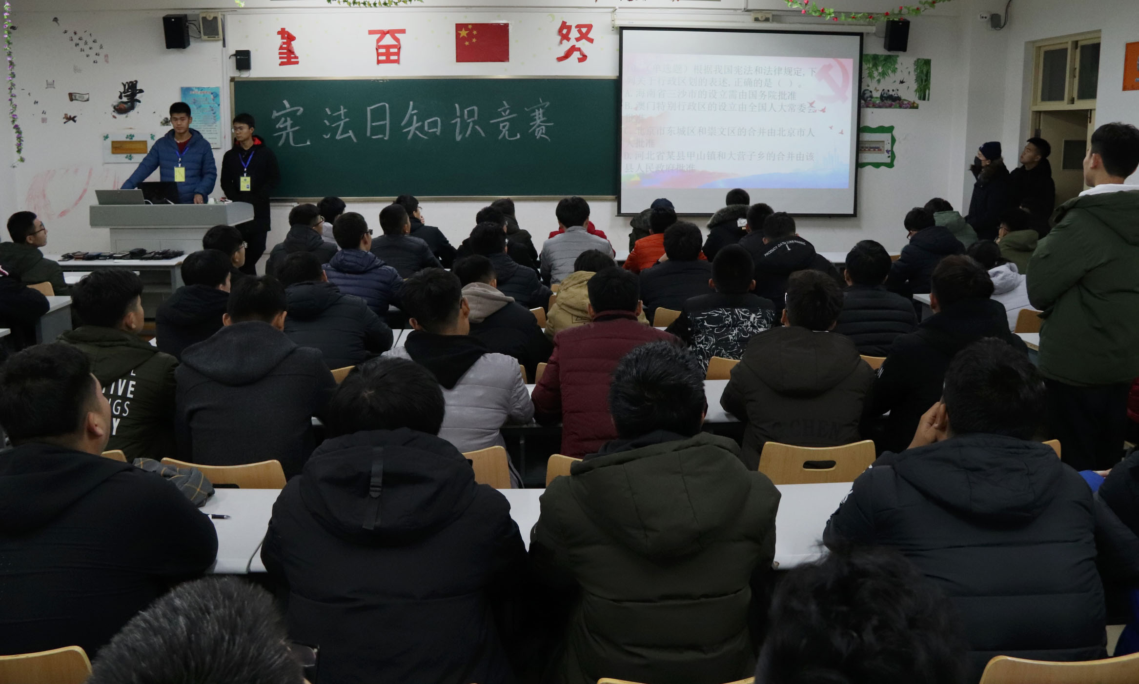 競賽過程中,參加知識競賽的選手們需要對大屏幕上隨機出現的有關憲法及法律法規基礎知識的題目進行作答。參賽選手沉著冷靜,認真思考,把自己學到的憲法及法律法規知識運用到了競賽當中。此次競賽提高了我系學生的法律意識,普及了法律基礎知識,加深了廣大同學對憲法的理解,達到了宣傳憲法的目的。