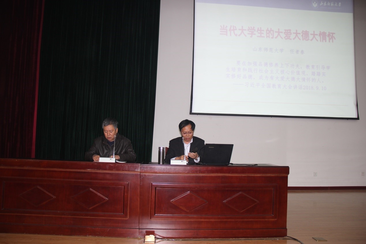 11月27日下午,基礎部(思政部)邀請山東師范大學馬克思主義學院教授、思想道德教研部主任任者春作《當代大學生的大愛大德大情懷》講座。講座由基礎部(思政部)主任賈明斌主持,學院黨委宣傳統戰部部長杜樹元、副部長楊慧及廣大師生參加講座學習。