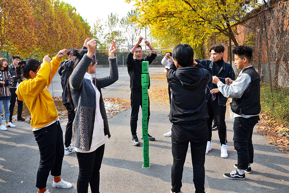 本次團建活動將學生干部分為五組,每組需要在規定的時間內通過團隊配合的方式,使用吊鉤將方塔搭起,根據方塔整齊度和消耗時間決定勝負。活動期間,各組成員全神貫注,小心翼翼地控制手中的繩子和所系方塊,經過各組成員的不懈努力,方塔也逐漸成型。最終,三組與五組學生干部隊伍憑借出色的平衡能力與完美的配合贏得本次團建活動。