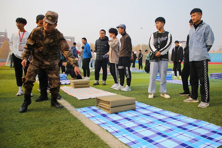 亞洲人成電影網站在線觀看:比賽開始前,由退伍軍人進行疊被子標準展示,給大賽預熱。其后開展各書社疊被子比賽。