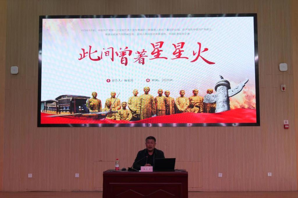 楊榮濤以《此間曾著星星火》為題,從中共一大談起,圍繞“黑暗中的微光”“信仰的啟航”“堅守與迷失”三個方面對黨的歷史展開解讀。以王盡美、李漢俊、何叔衡的英雄事跡為例,激勵大家將個人的青春奮斗融入到黨和人民的事業里、融入到中華民族偉大復興的中國夢中。