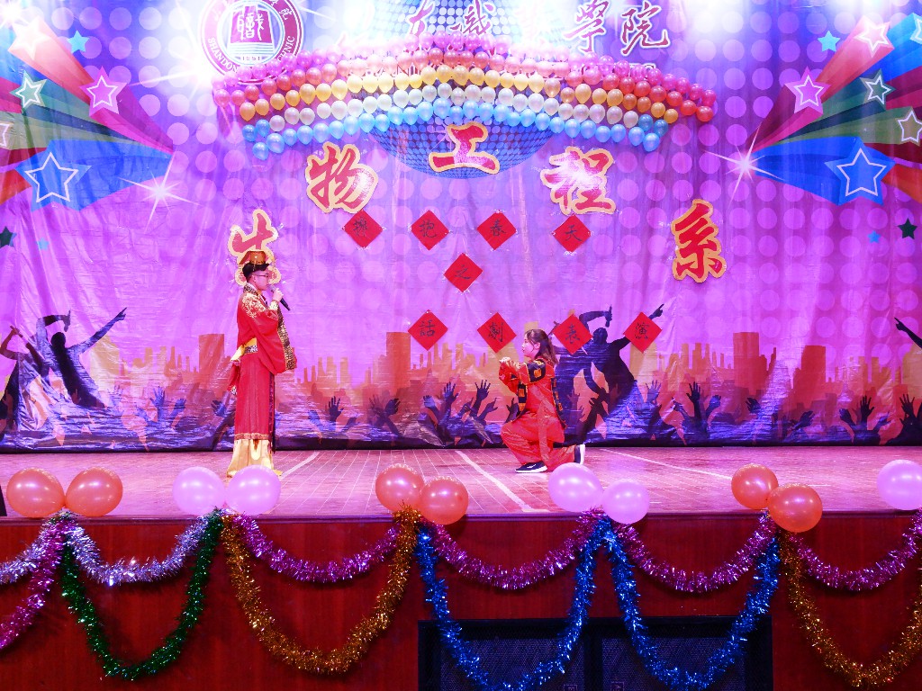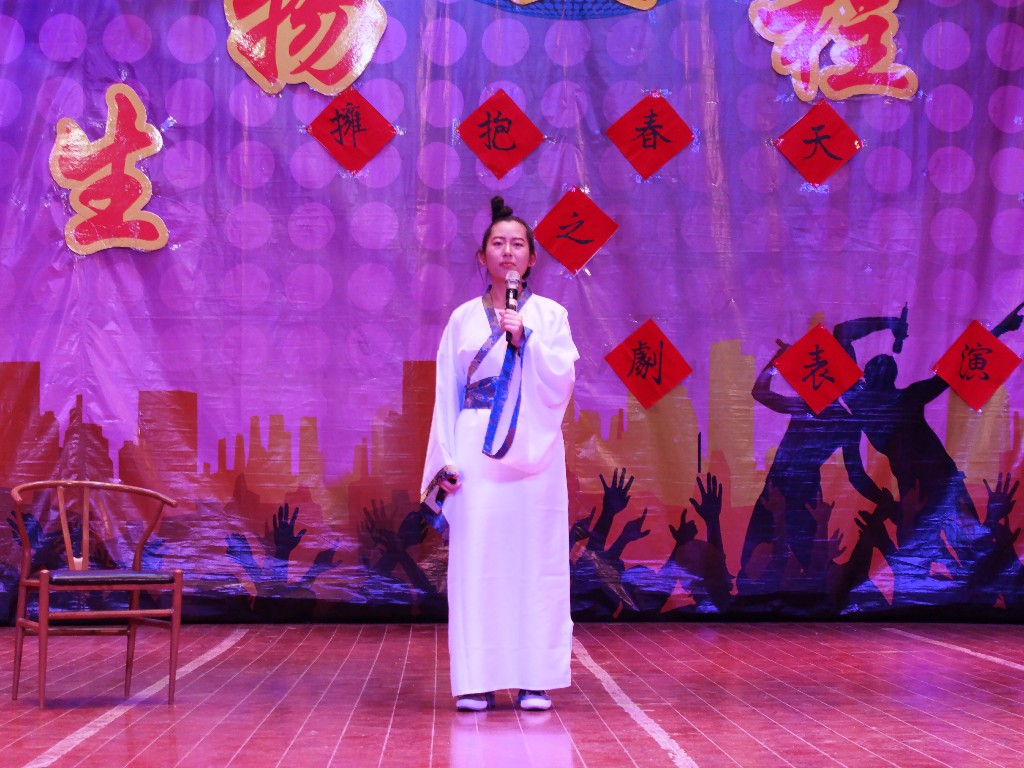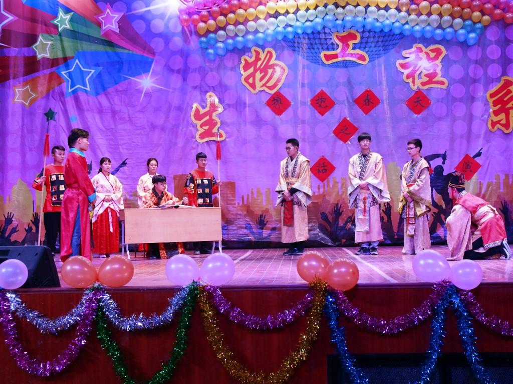 晚風怡人,燈光絢麗。話劇表演由《暗戀桃花源》拉開帷幕,一個個離別與重逢瞬間催人淚下,贏得觀眾陣陣掌聲;伴隨著一曲《木蘭辭》,話劇《花木蘭》上演,同學們用精湛演技演繹親子離別、身陷沙場,感人肺腑;《長恨歌》凄美感人,為天下有情人送出了美好祝愿;話劇表演中場,一個簡單小游戲,使現場氣氛飛漲。隨后反串劇《孔雀東南飛》逗笑了同學們,耳熟能詳的《完璧歸趙》盡展機智與勇氣,豪邁的《荊軻刺秦王》盡顯忠心與悲壯。