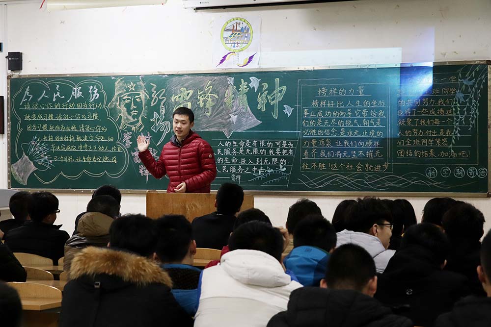 班會開展形式多樣,內容豐富,各班設計的板報主題鮮明,布局美觀,圖文并茂,介紹了雷鋒的生平事跡和身邊的雷鋒故事,再現了雷鋒日記和雷鋒名言,充分詮釋了雷鋒精神的內涵。通過觀看視頻《雷鋒日記》,同學們進一步走近雷鋒、了解雷鋒,緬懷雷鋒,進一步深刻認識雷鋒精神的精髓。視頻觀看結束后,同學們感觸頗深,踴躍發表感想。“今年寒假,我跟隨協會到濟南火車站進行志愿服務,雖然天氣寒冷,但能用舉手之勞為群眾的出行帶去便利、用實際行動去服務民生,讓我感到奉獻的青春最美麗,也讓我感到‘雷鋒精神’的內涵所在。” 紅藍青青年志愿者協會志愿者、供電1732班魏銘均同學的發言,語言樸實,感人真摯,令人動容。