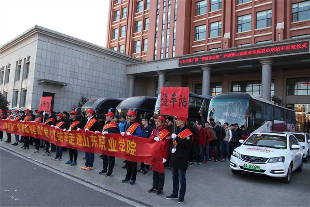 學院團委書記兼學生處處長王偉在簡短致辭中向一直以來關心、支持學院發展的各位嘉賓表示衷心感謝,尤其是山東交通廣播致力于在致力于服務大學生成長和傳播社會正能量方面為我院學子提供的防電信網絡詐騙主題教育及愛心送站服務表示深深的贊許和感謝。濟南市交通委運管辦客運管理處副處長郭浩、山東交通廣播副總監智勇分別就2018年春運工作安全問題和“情暖春運路”活動開展等致辭,學院“紅藍青”青年志愿者協會會長李皓同學代表春運志愿者發言,承諾在2018年春運志愿服務中踐行志愿精神,用實際行動詮釋奉獻與擔當,弘揚正能量,溫暖回家路,彰顯山東職業學院青年學子的良好精神風貌。現場嘉賓共同為“愛心送站車”啟動,車隊出發,同學們踏上溫暖返鄉路。